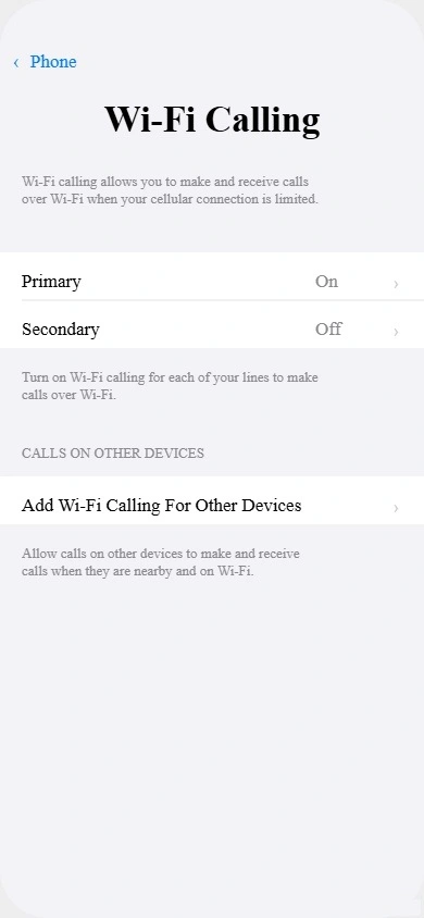 When you have two SIM lines active on your iPhone, WiFi calling needs to be enabled separately for each line. Turning it on for one line does not automatically apply it to the other.