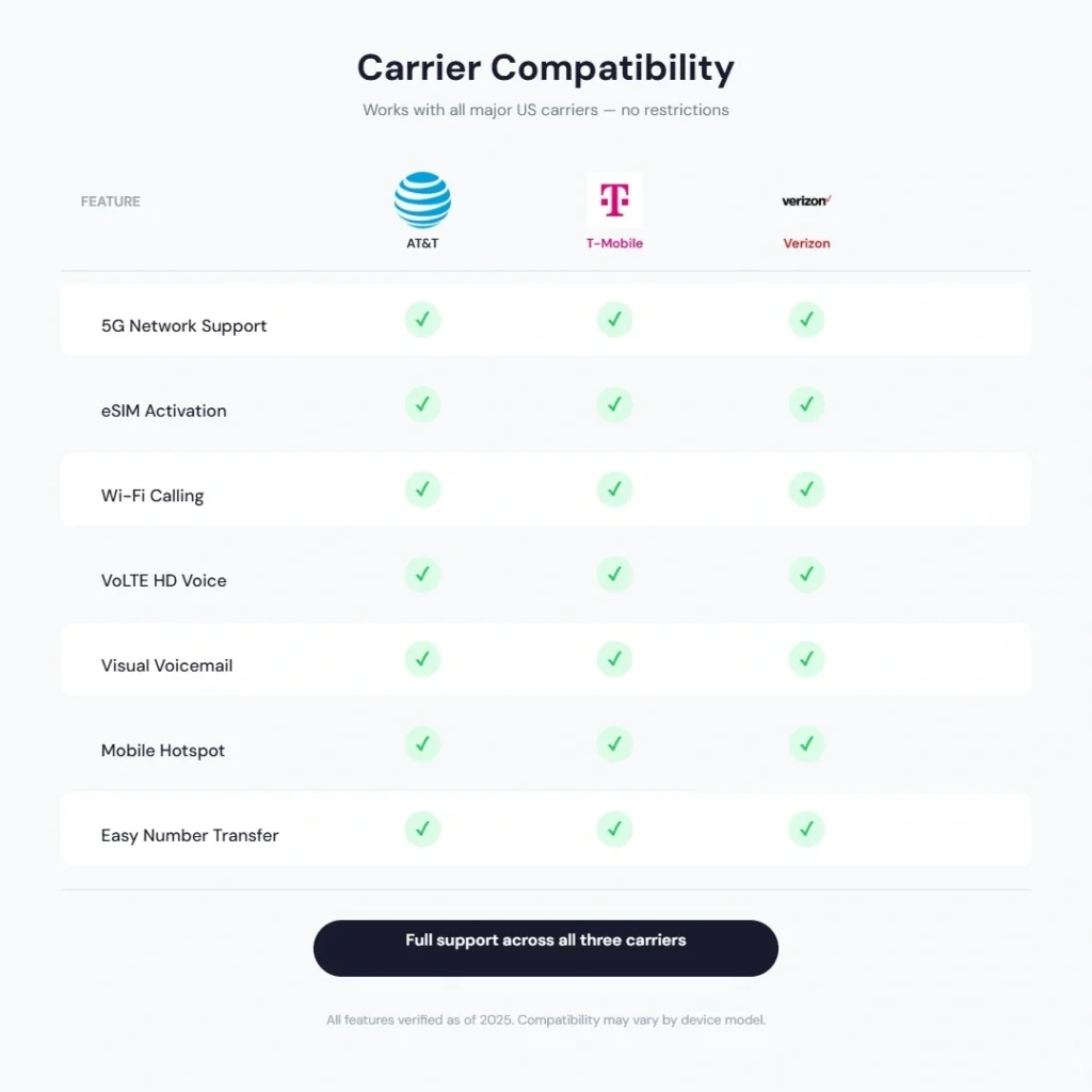 Verizon also fully supports WiFi calling on iPhone. Most Verizon postpaid plans include it, though some older legacy plans may need a quick check.