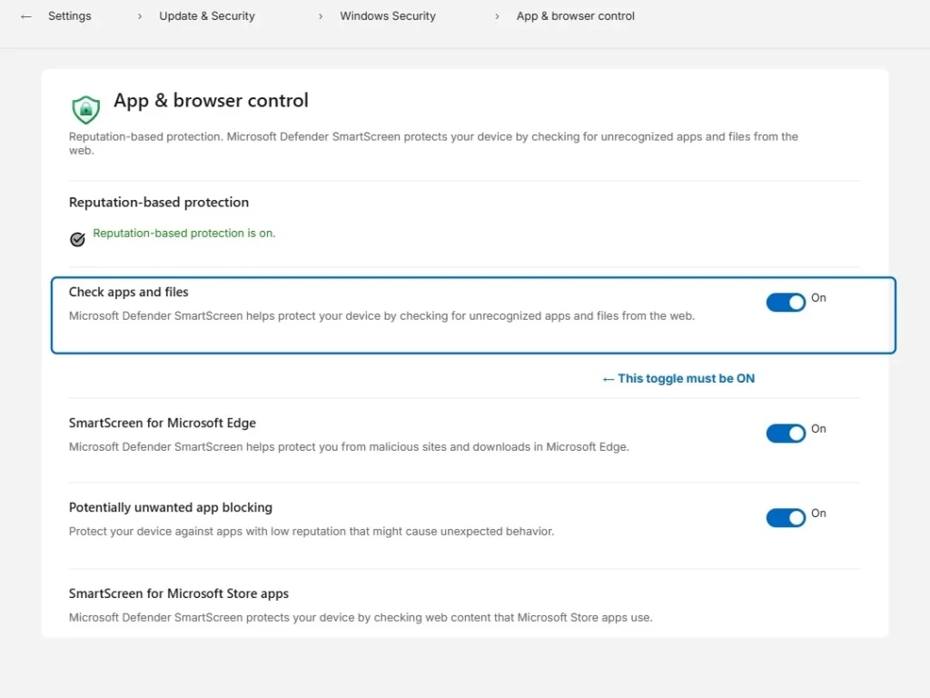 If you came directly to this section looking for a quick answer, here is your starting point. Go back to Fix 1 and turn off Reputation-Based Protection in Windows Security. That single change resolves the error for the majority of people within two minutes.