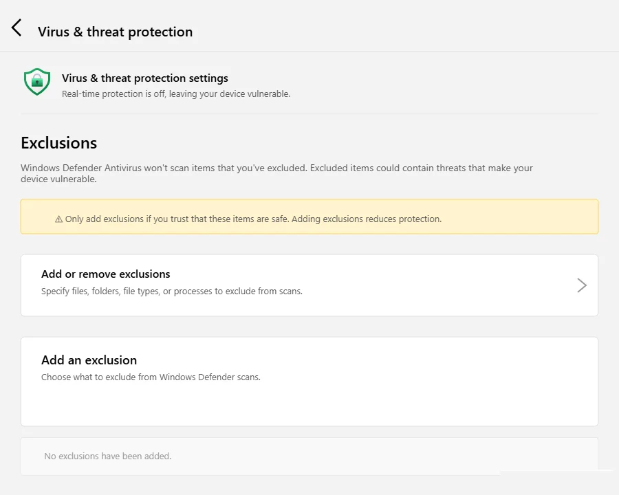 Step 4: Scroll further down until you reach the Exclusions section. Click Add or remove exclusions.