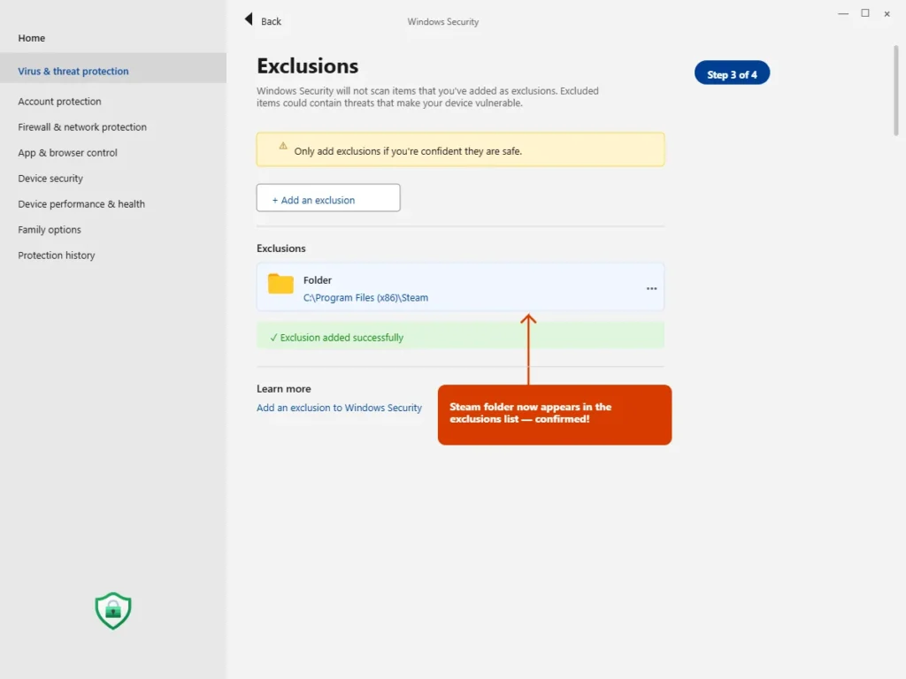 Step 8: Windows Defender will now exclude the entire Steam folder from real-time scanning. Try launching Steam again.