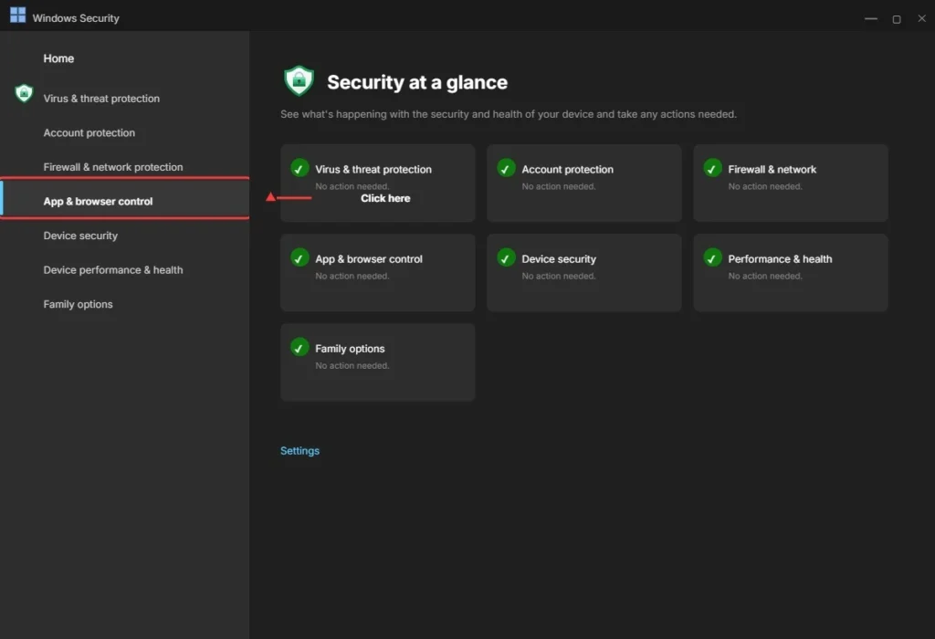 Step 2: Inside Windows Security, click on App and browser control in the left sidebar. This is the section that manages how Windows handles apps and files from the internet.